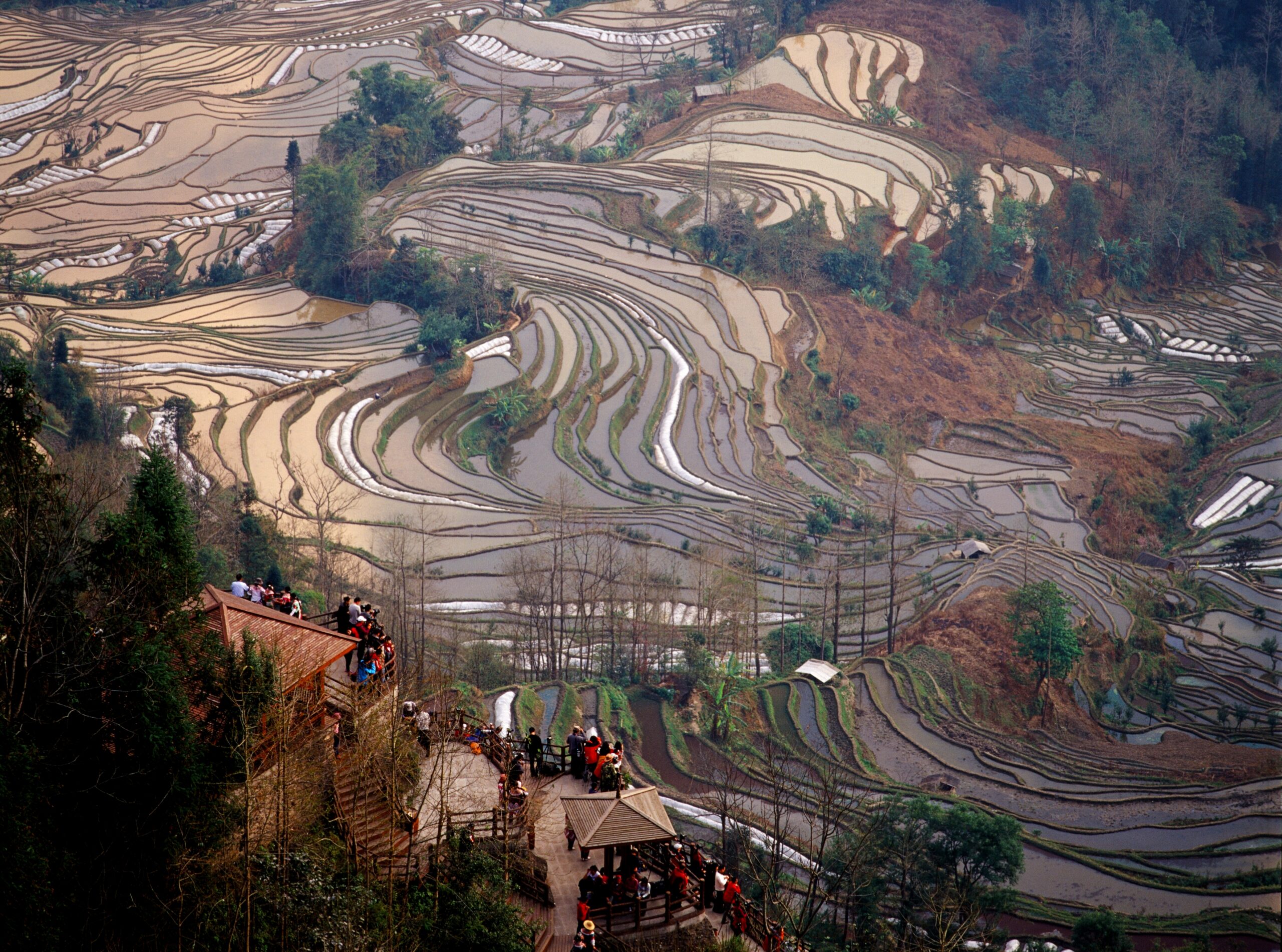 元陽梯田 位於元陽縣哀牢山,是哈尼族人世世代代留下的傑作,梯田的開墾隨山勢地形變化,坡緩地大則開墾大田,坡陡地小則開墾小田,甚至溝邊坎下石隙也開田,因而梯田大者有數畝,小者僅有簸箕大,往往一坡就有成千上萬畝;由於哀牢山全是崇山峻嶺,所有的梯田都修築在山坡上,梯田坡度在15度至75度之間,梯田最高級數達3000級,這在中外梯田景觀中是罕見的。每年中的11月至次年4月間,是元陽梯田景觀最佳觀賞拍攝時間。